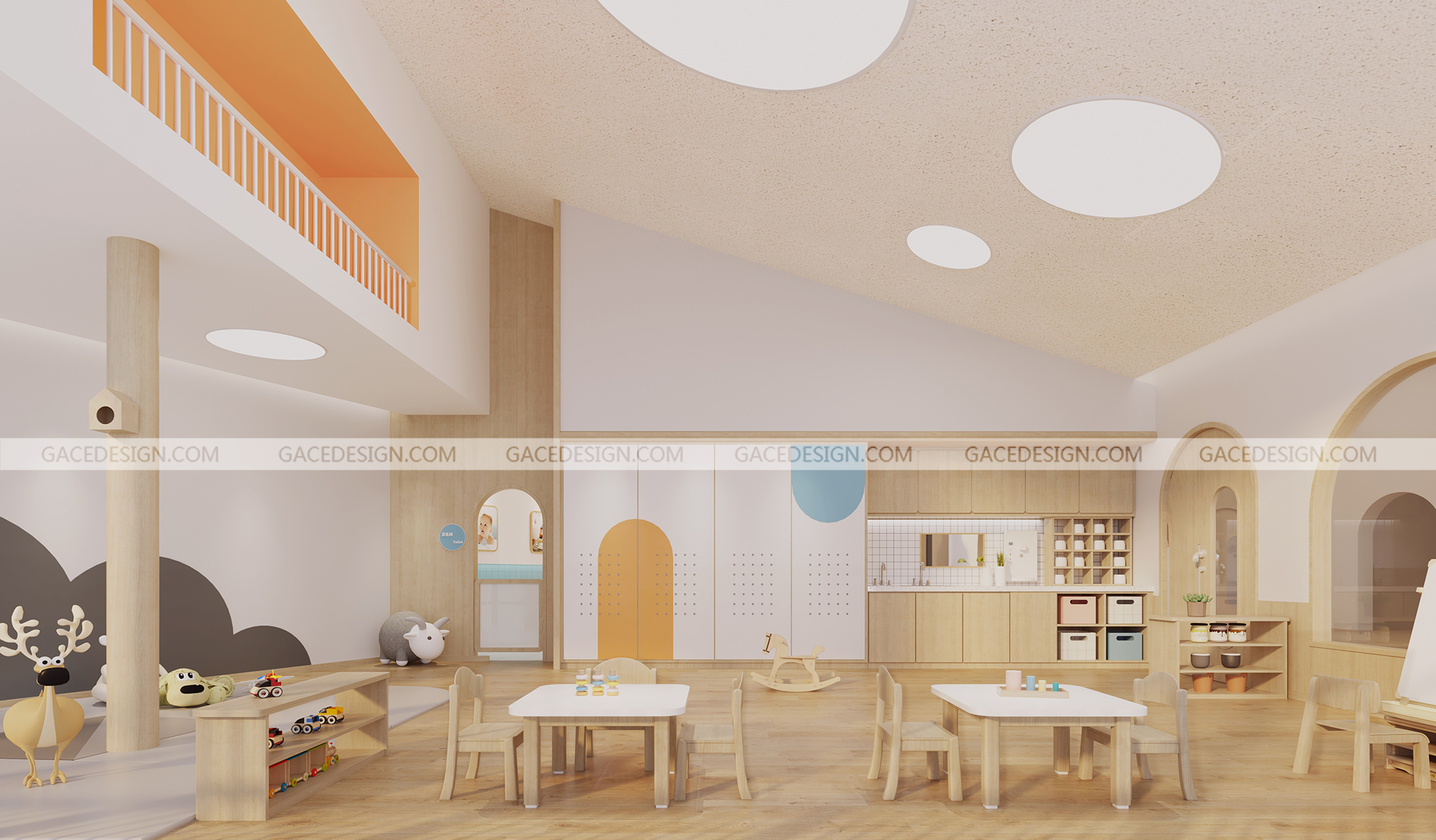 設計概括:作為浙江省臺州&嘉興市的第一批示范性且根據托育設置標準建設的盈利性高端托育園,總面積700&1000平。我們把設計重點放在了教育理念和兒童心理層面上。空間中除了功能性,以滿足孩子們的日常食宿,需要更多的可拓展性。場地為純粹的室內空間,而幼兒天性的釋放往往在戶外。如何將戶外元素與功能性結合,我們想到用建筑思維來解構空間,讓空間立體而生動。結合陳鶴琴老先生的教育理念,我們在室內設計了富有親和力、天然感的兒童探索洞穴和一條無邊界的跑道。