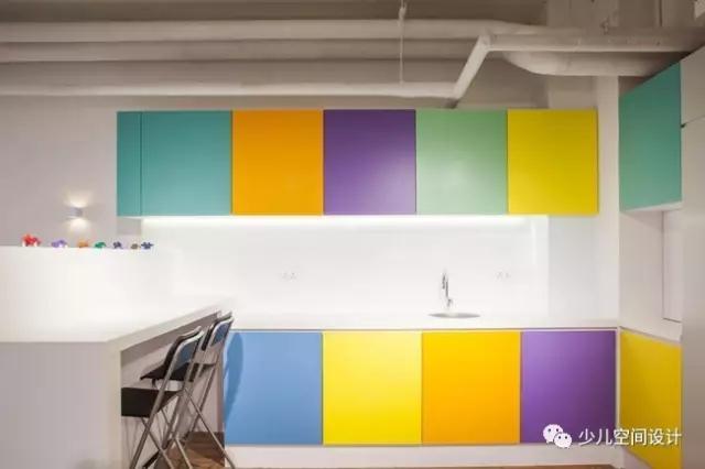 就餐區和休息區是專門為家長和老師設計的兩個區域,他們可以在這里交流溝通孩子的情況。就餐區在功能上是一個帶有多重色彩櫥柜的敞開式廚房,它這樣的設計還可以激發孩子的興趣以及異想天開的想象力。就餐區的顏色都源自Babysteps的標識中相同的色調,與幼兒樂園整體的設計在視覺上形成統一,同時它也與整個室內空間微妙的單色調相互協調。