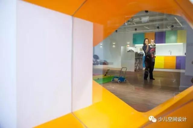 探索和運動區是幼兒樂園的重點區域。幼兒園室內設計 在這個開放式的,明亮而怡人的活動區,可以容納多種運動方式:純粹運動的方式、感知觸覺的方式、還有安靜的方式。一面帶有幾何圖案的彩色墻壁極具特色,這堵墻圍成了一個儲存區角,并且自然而然地將活動區內不同方式的運動區分割開來。進一步來說,這種分割還可以讓孩子和家長通過墻上幾何圖案的窗框看到教室里面的情景。