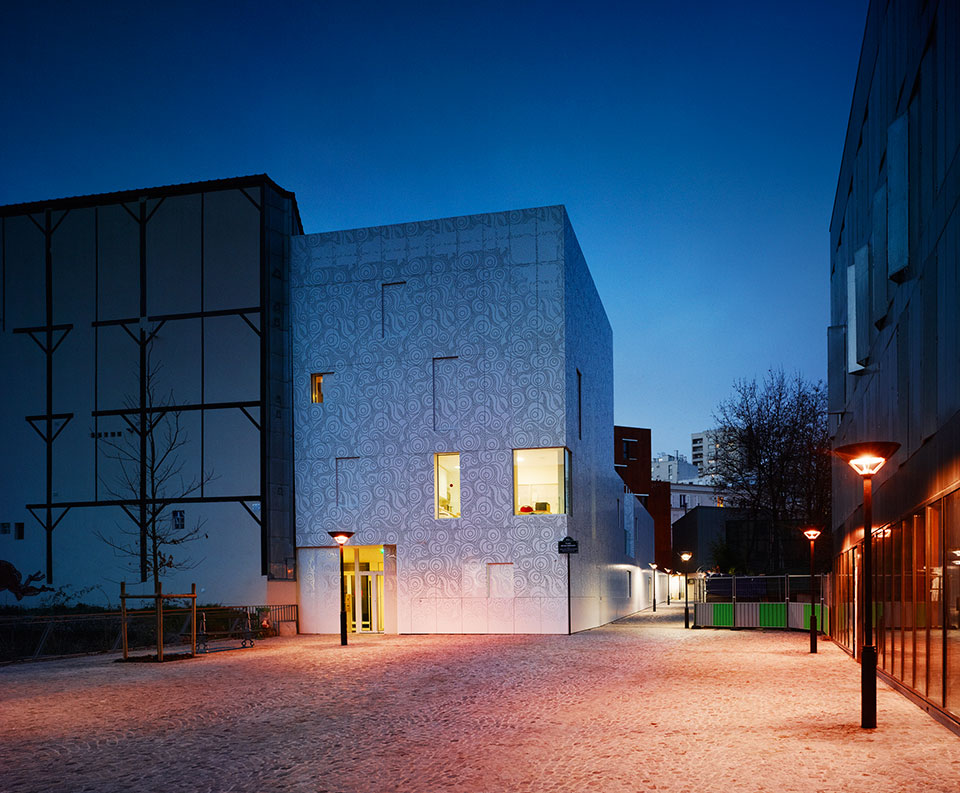 法國建筑事務(wù)所Avenier Cornejo設(shè)計的巴黎20區(qū)幼兒園建成,這所可容納66個孩子的幼兒園是一座獨特的建筑,為兒童提供安心的環(huán)境。建筑以混凝土為結(jié)構(gòu),滿滿占據(jù)著三角形地塊,并沿兩側(cè)邊緣開了三個內(nèi)庭院,為建筑提供充足的陽光與光線。建筑周身覆蓋有著美麗花樣的金屬穿孔板。這層金屬外表皮還覆蓋了部分窗戶,為其提供過濾的光,并在夜晚像燈籠一樣透光。傍晚來臨的時候,兩旁的路燈亮出詳和的燈光,好像都在刻意討好這所幼兒園。它就像一位非常漂亮文雅的姑娘,周圍建筑和路燈都是敗在它的石榴裙下的紳士! 此幼兒園的顏色和圖紋,與周圍建筑想必是那么與眾不同,一下子就能夠把人們的目光吸引住了。