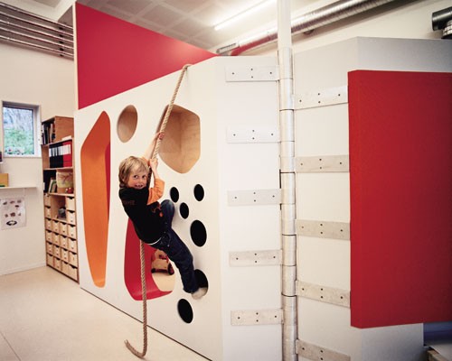 墻是Tromso幼兒園空間的核心設計元素。普通意義上僅僅承擔分隔空間與隔音作用的墻壁被賦予了更豐富的功能,或者說,家具與墻的界限變得非常模糊。簡單的折疊和推拉墻面即可改變房間的大小,創造出容納新功能的空間,如同童話故事中的魔法墻。墻面擁有鮮艷的色彩和不同的材質,并且開設了許多形狀大小各不相同的洞口。