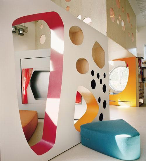 這些洞口可以被開發成多種用途———書架,抽屜,公仔盒;稍大的洞口還可以允許孩子們窩在里面擁有一個獨立的玩耍空間,為捉迷藏提供了絕好的空間;有的洞口設計了小小的窗簾,限定了空間,成為一個“成人勿入”的地方,也是玩“過家家”的絕佳場所。較高的墻安裝了攀援設施,在保證安全的前提下允許孩子們攀爬;較厚的墻內設計了可容納孩子躺臥的微型小床,成為一個很有安全感的小臥室,超小的尺度使得成人只能“偷窺”,無法進入